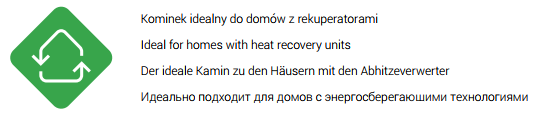 Dodatkowo piec posiada system czystej szyby (kurtyna powietrza), czyli powietrze dostarczane jest bezpośrednio na szybę poprzez system kanałów umieszczonych na bokach kominka. W ten sposób dostarczany jest tlen do górnej części komory spalania, w której następuje dopalanie gazów powstałych w procesie spalania drewna, co dodatkowo ogranicza emisję szkodliwego CO do atmosfery.